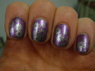 The base is Harmony and the stamps are Cherish (the green one) and I used Konad plate M2. The Romantique collection is very pretty by the way, and probably the first I've seen that are opaque in one coat. It makes them excellent to use with the Konad system, if the metallic alone is a bit much.